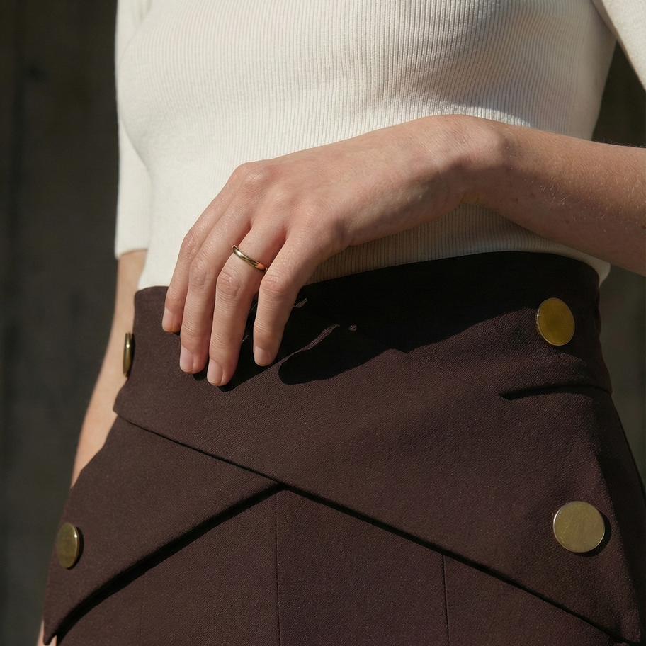 Bel kısmındaki kruvaze (çapraz) bant detayı, belinizi daha ince vurgularken, yanlarda bulunan gold (altın rengi) düğmeler tasarıma lüks bir hava katıyor.